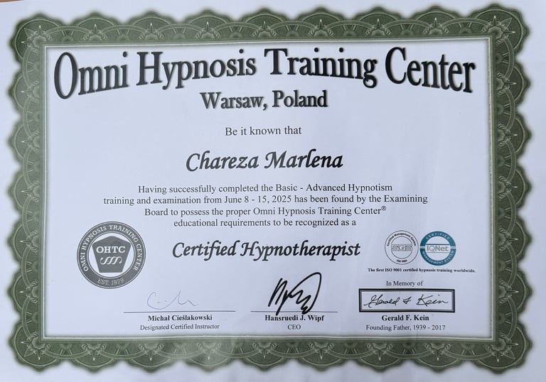 Zainspirowana własną transformacją zapragnęłam zająć się hipnoterapią profesjonalnie, zdobywając najlepsze możliwe kwalifikacje. Ukończyłam prestiżową szkołę OMNI Hypnosis Training Center, uznawaną za absolutną światową czołówkę w dziedzinie hipnozy i hipnoterapii. To miejsce, w którym standardy pracy, techniki i podejście do klienta są na najwyższym poziomie. Ale na tym nie poprzestałam — wciąż się doszkalam, zdobywam nowe umiejętności i poszerzam wiedzę, aby jeszcze lepiej rozumieć tajniki ludzkiego umysłu i skuteczniej prowadzić moich klientów przez proces zmiany by z łatwością sięgali po swoje marzenia.
